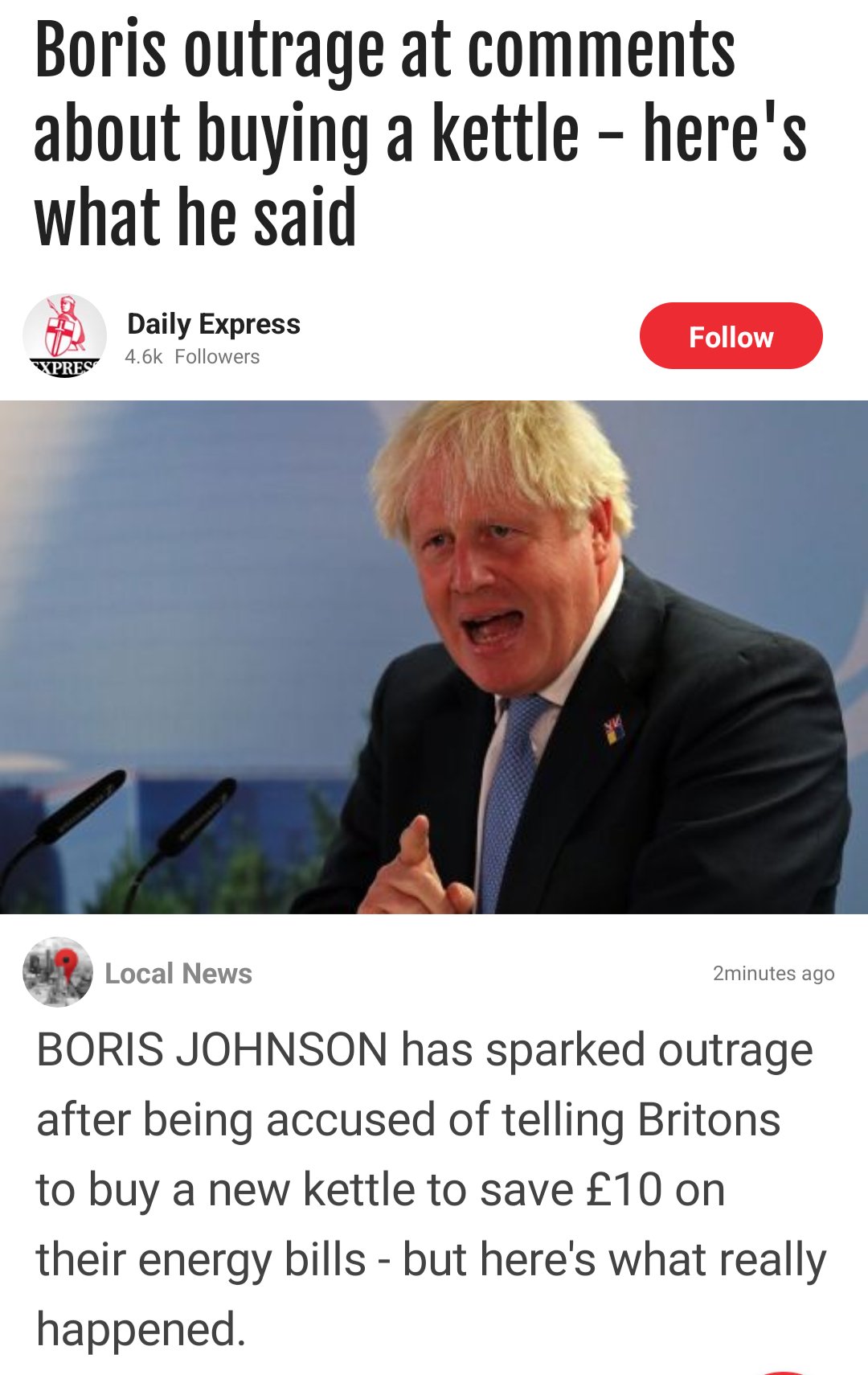 1 day agoHe then made this analogy. 9 hours agoGyles Brandreth has defended Boris Johnson s after the Prime Minister suggested families buy a new kettle to save them a whopping 10 on their energy bills. 1 day agoComments made by Boris Johnson are going viral after he had a bizarre solution to the cost of living crisis.